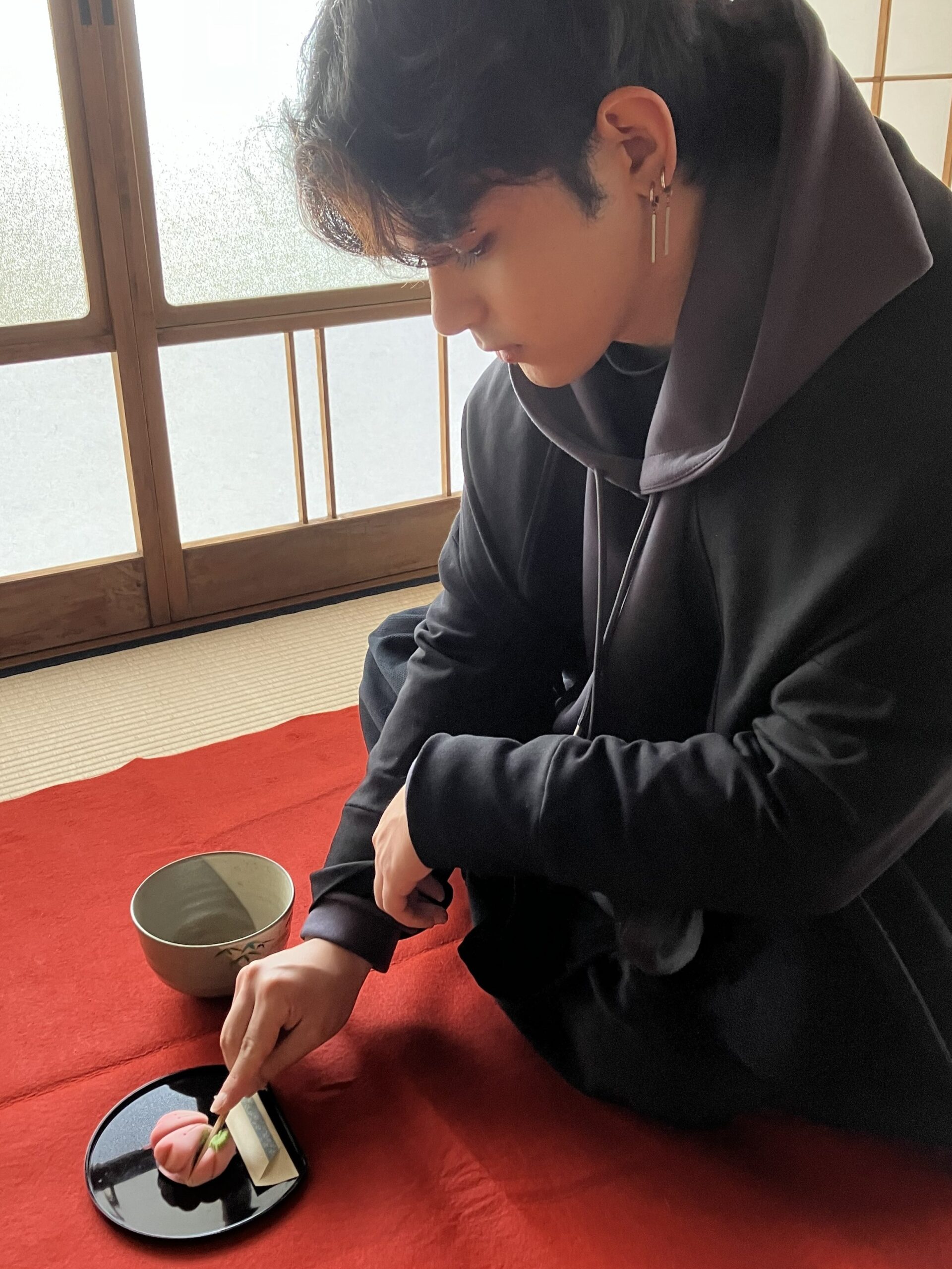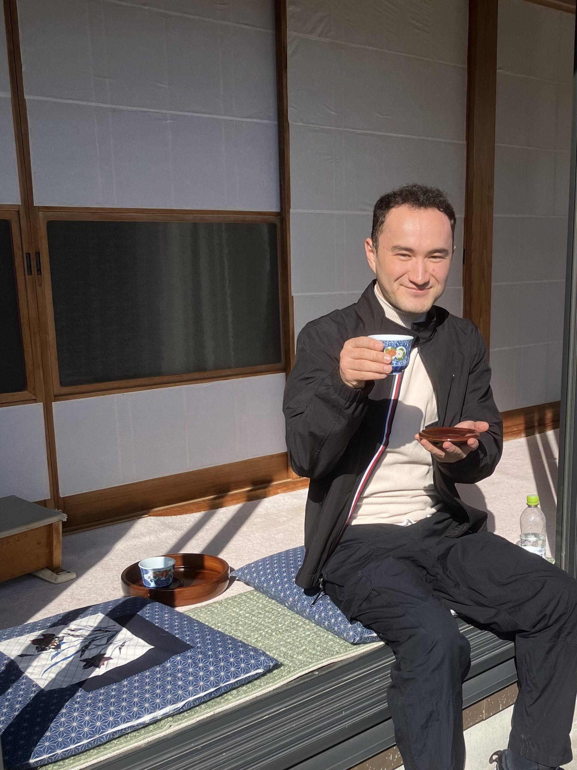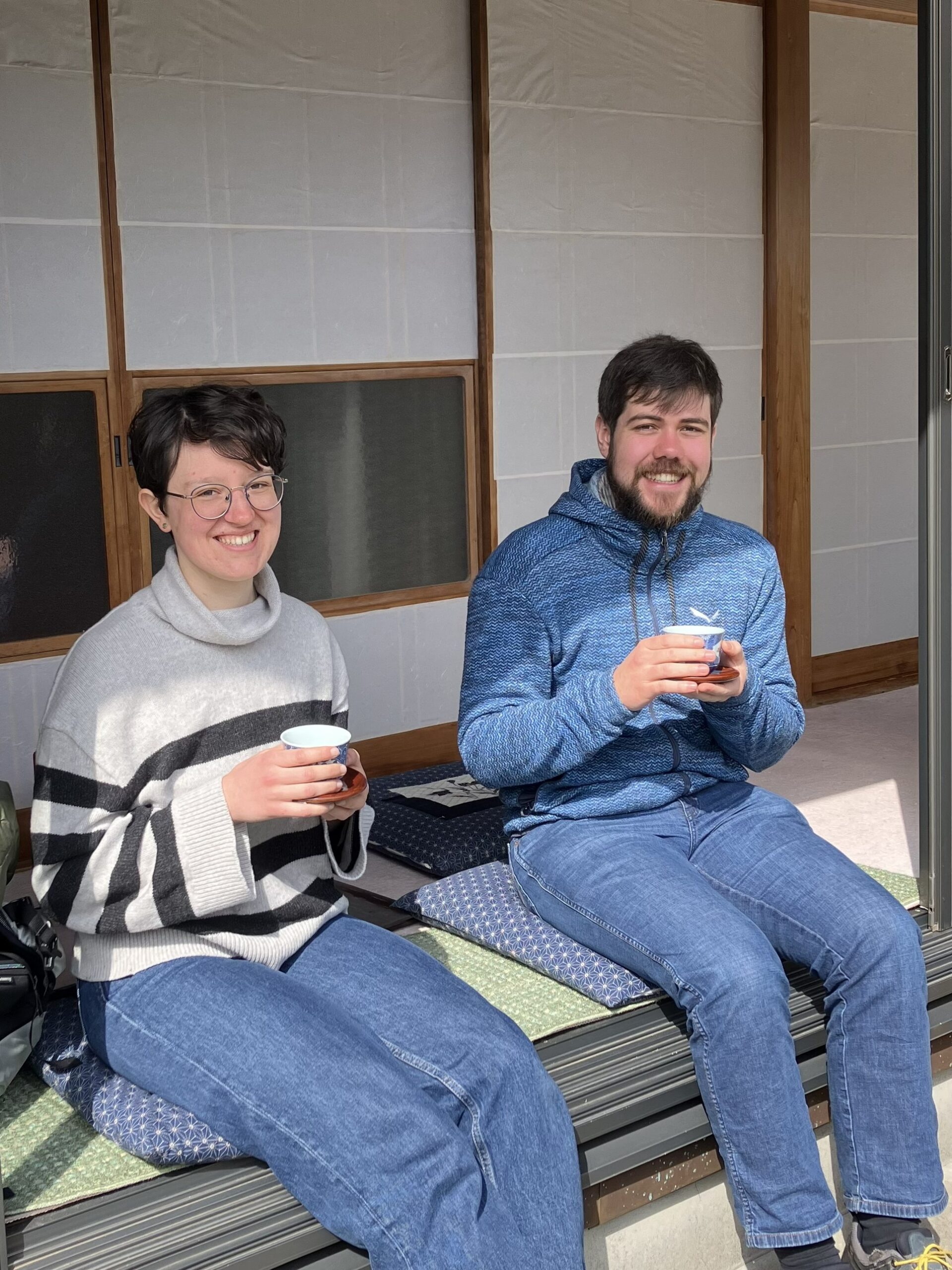 Relaxing with a cup of tea on a traditional Japanese engawa. Our tour guests enjoyed the calm atmosphere and left with smiles.